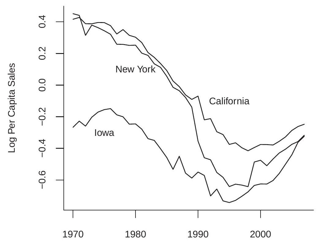 The authors were concerned whether their dynamic and trend specifications were correctly specified so tried some alternative specifications and interactions. To understand the trend issue we plot in Figure \(18.1\) the time-series path of the log of per-capita liquor sales for three states: California, Iowa, and New York. You can see that all three exhibit a downward trend from 1970 until about 1995 and then an increasing trend. The trend components of the three series, however, are not identical. This suggests that it may be incorrect to treat the trends as common across states.