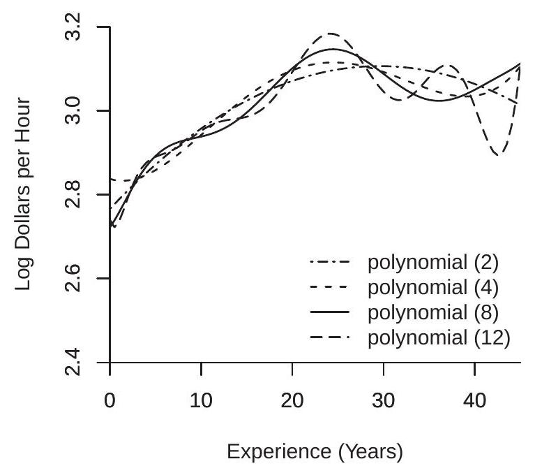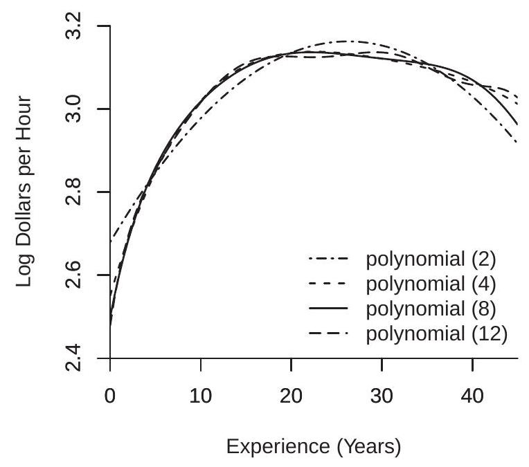 Examine panel (a) which shows the estimates for the sub-sample of white women. The quadratic specification appears mis-specified with a shape noticably different from the other estimates. The difference between the polynomials of order 4,8 , and 12 is relatively minor, especially for experience levels below 20.