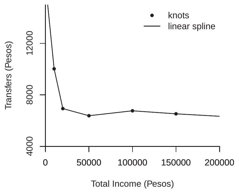 family’s income on non-governmental (e.g., extended family) income transfers \({ }^{3}\). A model of altruistic transfers predicts that extended families will make gifts (transfers) when the recipient family’s income is sufficiently low, but will not make transfers if the recipient family’s income exceeds a threshold. A pure altruistic model predicts that the regression of transfers received on family income should have a slope of \(-1\) up to this threshold and be flat above this threshold. We estimated this regression (including the same controls as the authors \({ }^{4}\) ) using a linear spline with knots at 10000, 20000, 50000, 100000, and 150000 pesos. These knots were selected to give flexibility for low income levels where there are more observations. This model has a total of 22 coefficients.