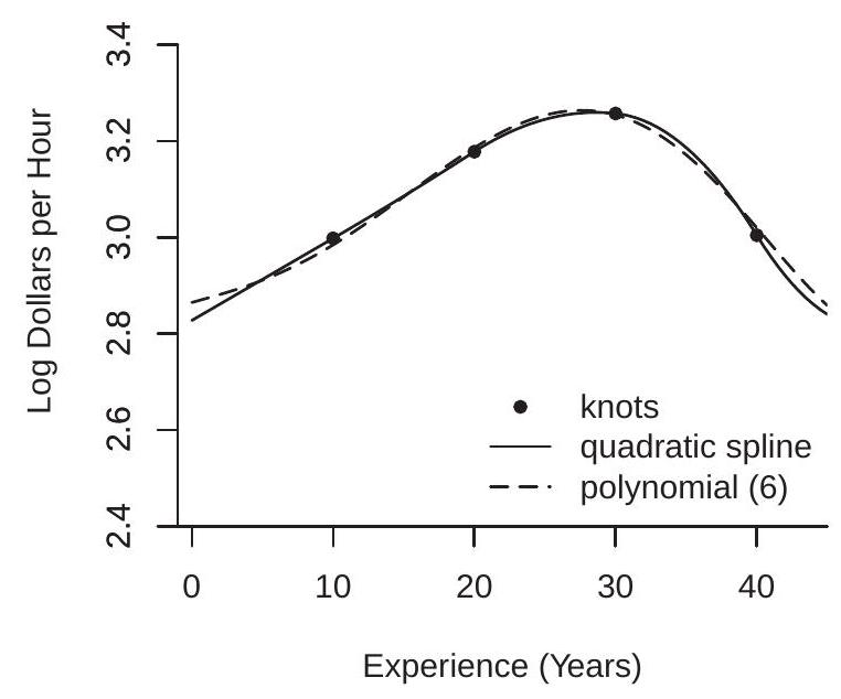 We use a quadratic spline with four knots at experience levels of \(10,20,30\), and 40 . This is a regression model with seven coefficients. The estimated regression function is displayed in Figure \(20.2(\mathrm{a})\). An estimated \(6^{\text {th }}\) order polynomial regression is also displayed for comparison (a \(6^{\text {th }}\) order polynomial is an appropriate comparison because it also has seven coefficients).