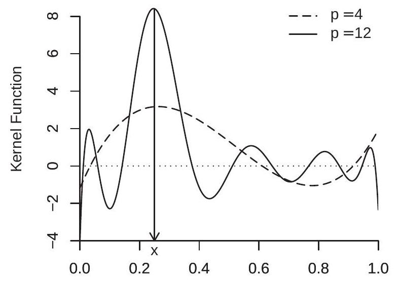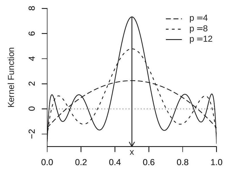 While this description has some merit it is not a complete description. As we now show, series regression estimators share the local smoothing property of kernel regression. As the number of series terms \(K\) increase a series estimator \(\widehat{m}_{K}(x)=X_{K}(x)^{\prime} \widehat{\beta}_{K}\) also becomes a local weighted average estimator.