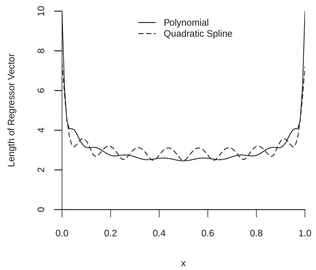 A computationally more robust implementation can be obtained by using orthogonal polynomials. These are linear combinations of the polynomial basis functions and produce identical regression estimators (20.6). The goal of orthogonal polynomials is to produce regressors which are either orthogonal or close to orthogonal and have similar variances so that \(\boldsymbol{X}_{K}^{\prime} \boldsymbol{X}_{K}\) is close to diagonal with similar diagonal elements. These orthogonalized regressors \(X_{K}^{*}=\boldsymbol{A}_{K} X_{K}\) can be written as linear combinations of the original variables \(X_{K}\). If the regressors are orthogonalized then the regression estimator (20.6) is modified by replacing \(X_{K}(x)\) with \(X_{K}^{*}(x)=\boldsymbol{A}_{K} X_{K}(x)\).