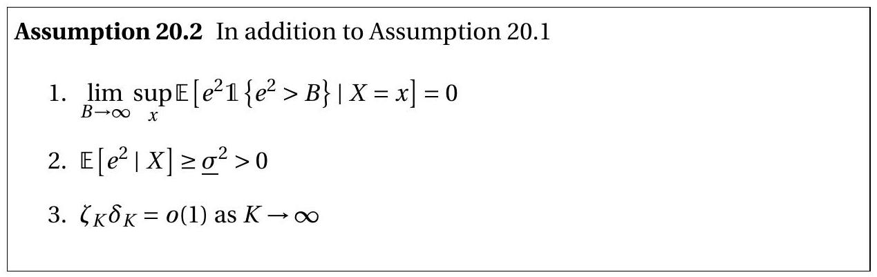 \({ }^{1}\) An alternative is to define \(\beta_{K}\) as the best uniform approximation as in (20.8). It is not critical so long as we are careful to be consistent with our notation. The coefficient is typically \({ }^{2}\) estimated by least squares