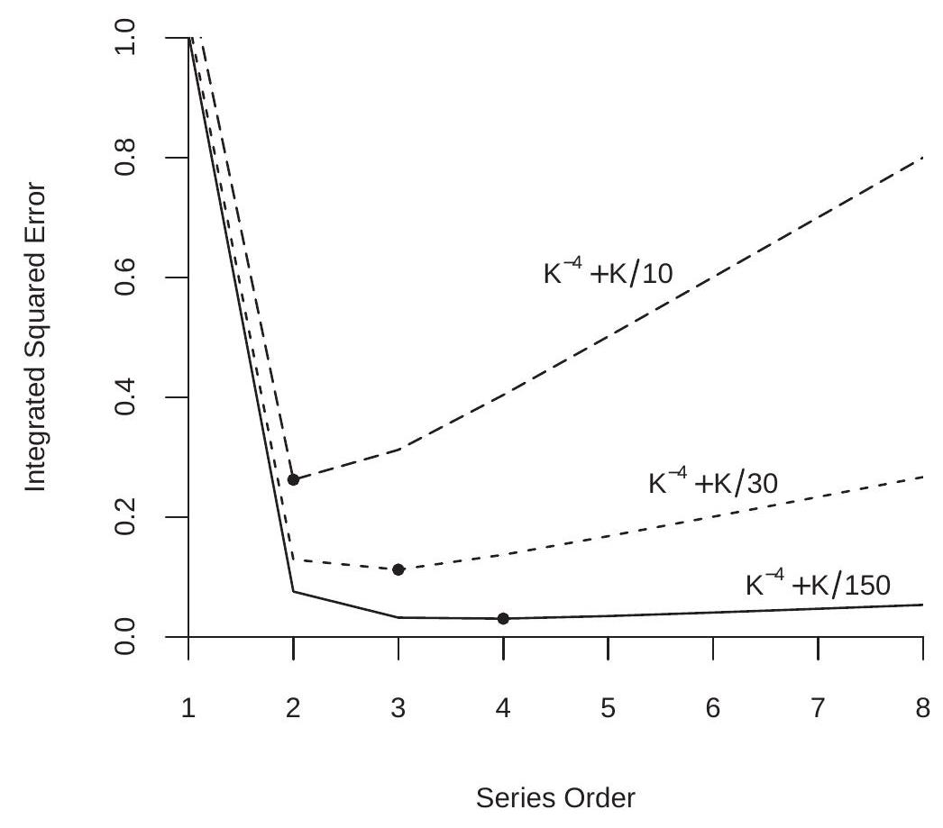 where the inequality is Assumption 20.1.2. This implies (20.45) is \(o_{p}\left(\delta_{K}^{2}\right)+O_{p}(K / n)\). Combined with (20.44) we find \(\operatorname{ISE}(K)=O_{p}\left(\delta_{K}^{2}+K / n\right)\) as claimed.