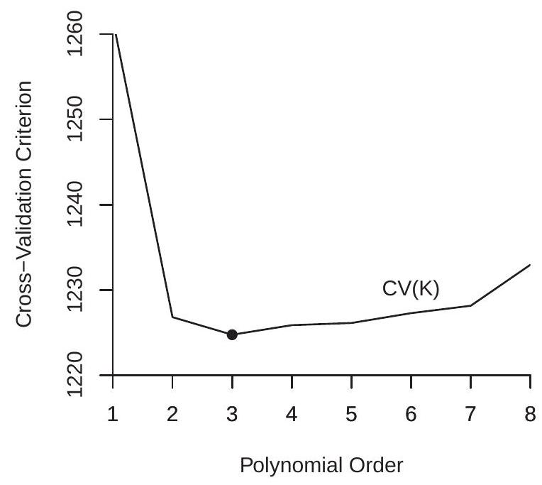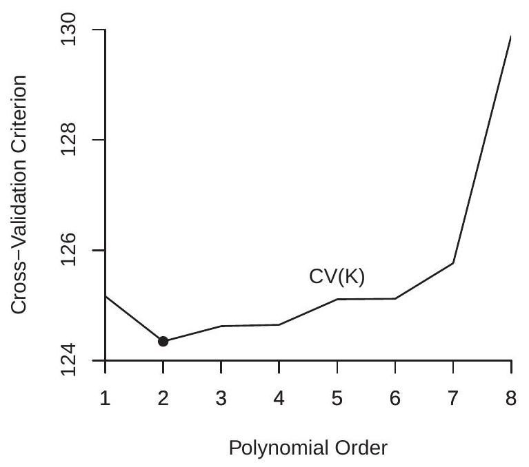 Exercise 20.12 Continuing the previous exercise, compute the cross-validation function (or alternatively the AIC) for polynomial orders 1 through 8.
