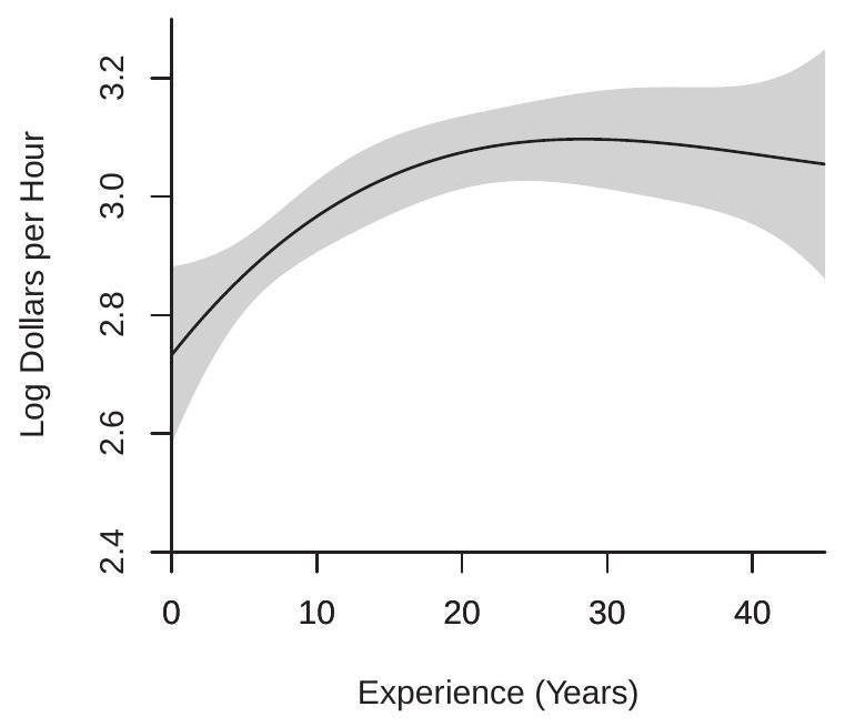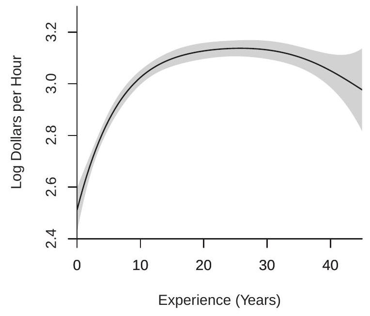 Interpret the findings. How do you interpret the estimated function for experience levels above 65 ?