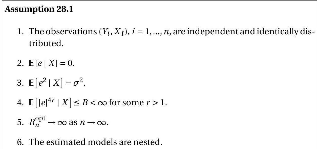 Proof of Theorem 28.9 First, we examine \(R_{n}(K)\). Write the predicted values in matrix notation as \(\widehat{\boldsymbol{m}}_{K}=\) \(\boldsymbol{X}_{K} \widehat{\beta}_{K}=\boldsymbol{P}_{K} \boldsymbol{Y}\) where \(\boldsymbol{P}_{K}=\boldsymbol{X}_{K}\left(\boldsymbol{X}_{K}^{\prime} \boldsymbol{X}_{K}\right)^{-1} \boldsymbol{X}_{K}^{\prime}\). It is useful to observe that \(\boldsymbol{m}-\widehat{\boldsymbol{m}}_{K}=\boldsymbol{M}_{K} \boldsymbol{m}-\boldsymbol{P}_{K} \boldsymbol{e}\) where \(\boldsymbol{M}_{K}=\boldsymbol{I}_{K}-\boldsymbol{P}_{K}\). We find that the prediction risk equals