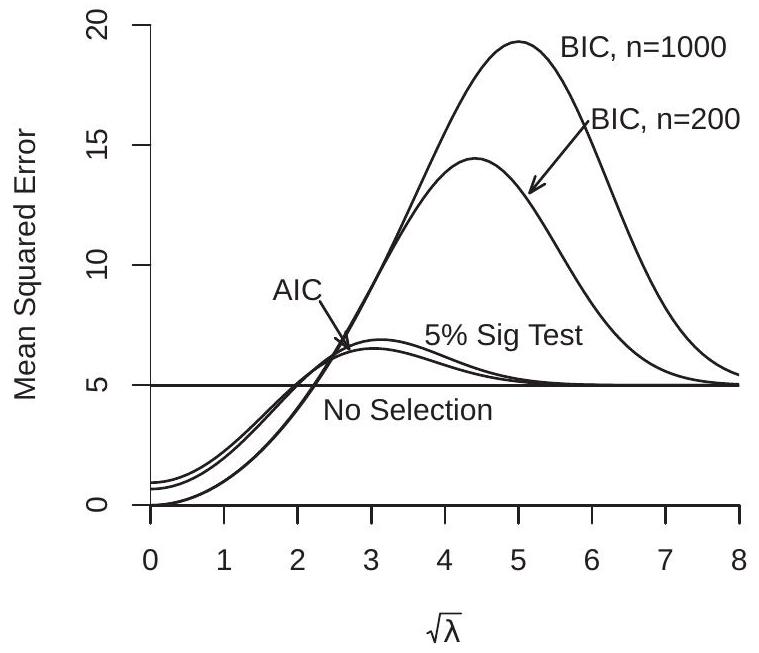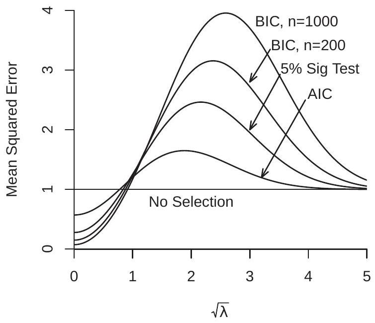 Selection based on WMSE suggests that we should ideally select the estimator \(\widehat{\theta}\) if \(K<\lambda\) and select \(\tilde{\theta}\) if \(K>\lambda\). A feasible implementation replaces \(\lambda\) with an estimator. A plug-in estimator is \(\hat{\lambda}=\widehat{\theta}^{\prime} \boldsymbol{V}^{-1} \widehat{\theta}=W\), the Wald statistic for the test of \(\theta=0\). However, the estimator \(\widehat{\lambda}\) has expectation