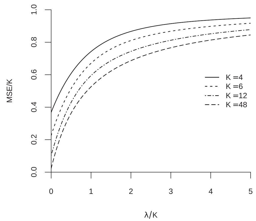 The comparison between (28.1) and (28.2) is a basic bias-variance trade-off. The estimator \(\widehat{\theta}\) is unbiased but has a variance contribution of \(K\). The estimator \(\widetilde{\theta}\) has zero variance but has a squared bias contribution \(\lambda\). The WMSE combines these two components.