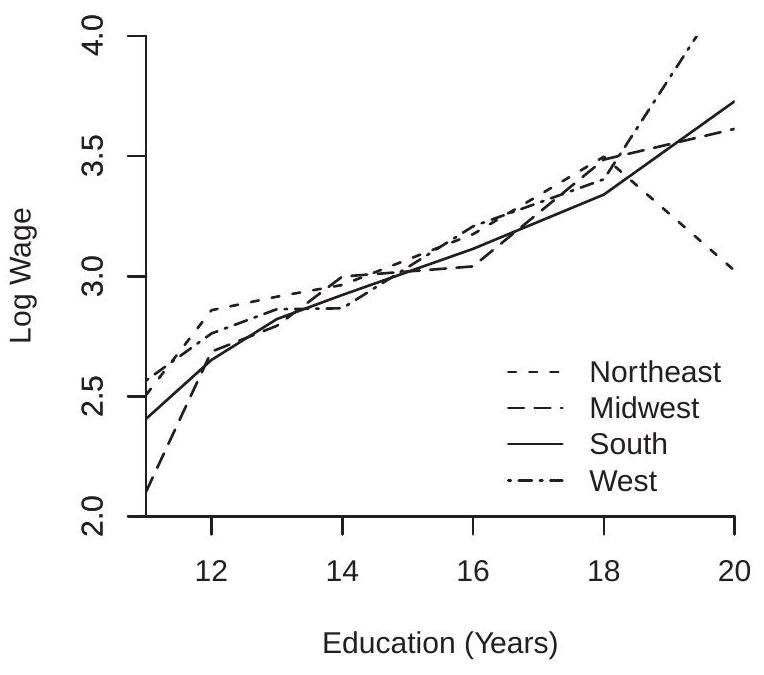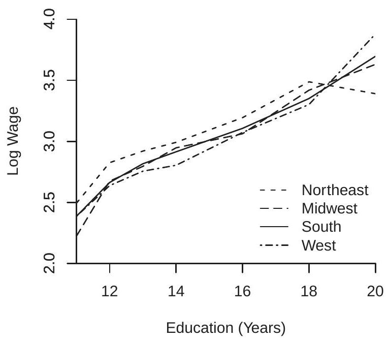 Take, for example, a wage regression. Suppose we want a model which includes education, experience, region, and marital status. How should we proceed? Should we estimate a simple linear model plus a quadratic in experience? Should education enter linearly, a simple spline as in Figure 2.6(a), or with separate dummies for each education level? Should marital status enter as a simple dummy (married or not) or allowing for all recorded categories? Should interactions be included? Which? How many? Taken together we need to select the specific regressors to include in the regression model.
