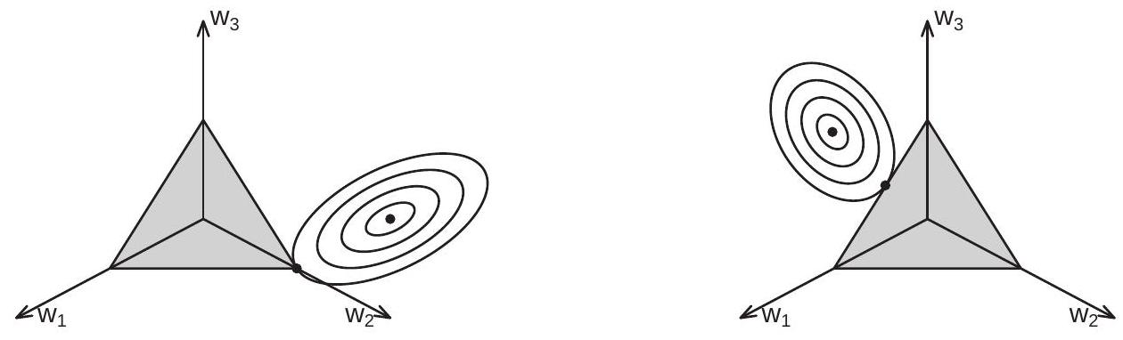 - Assume the models are nested with \(M\) the largest model. If the previous criterion were minimized over \(w\) in the probability simplex but the penalty was omitted, what would be the solution? (What would be the minimizing weight vector?)