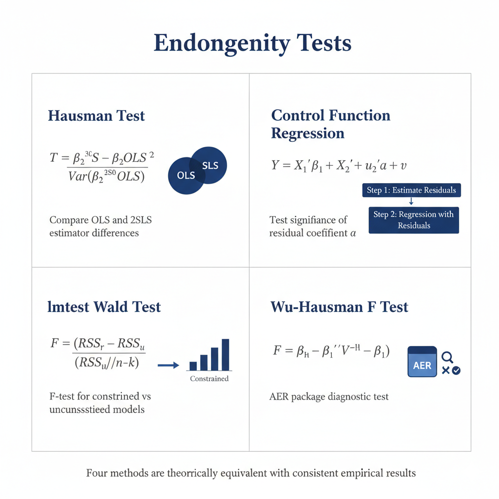 其中\(\widehat{\alpha}\)是控制函数回归中残差项的系数。这种等价性为内生性检验提供了多种实现方式,但结果应该是一致的。