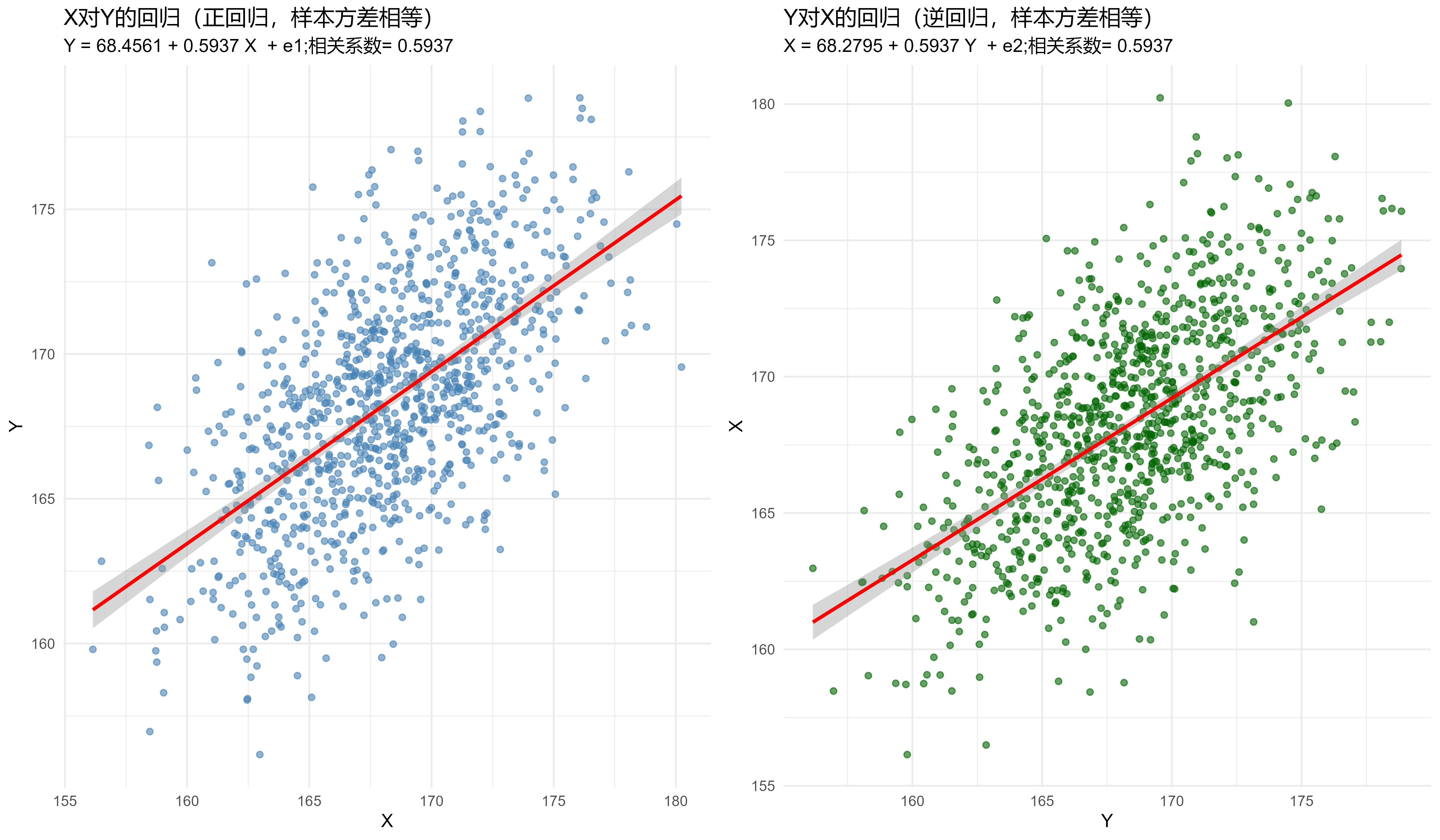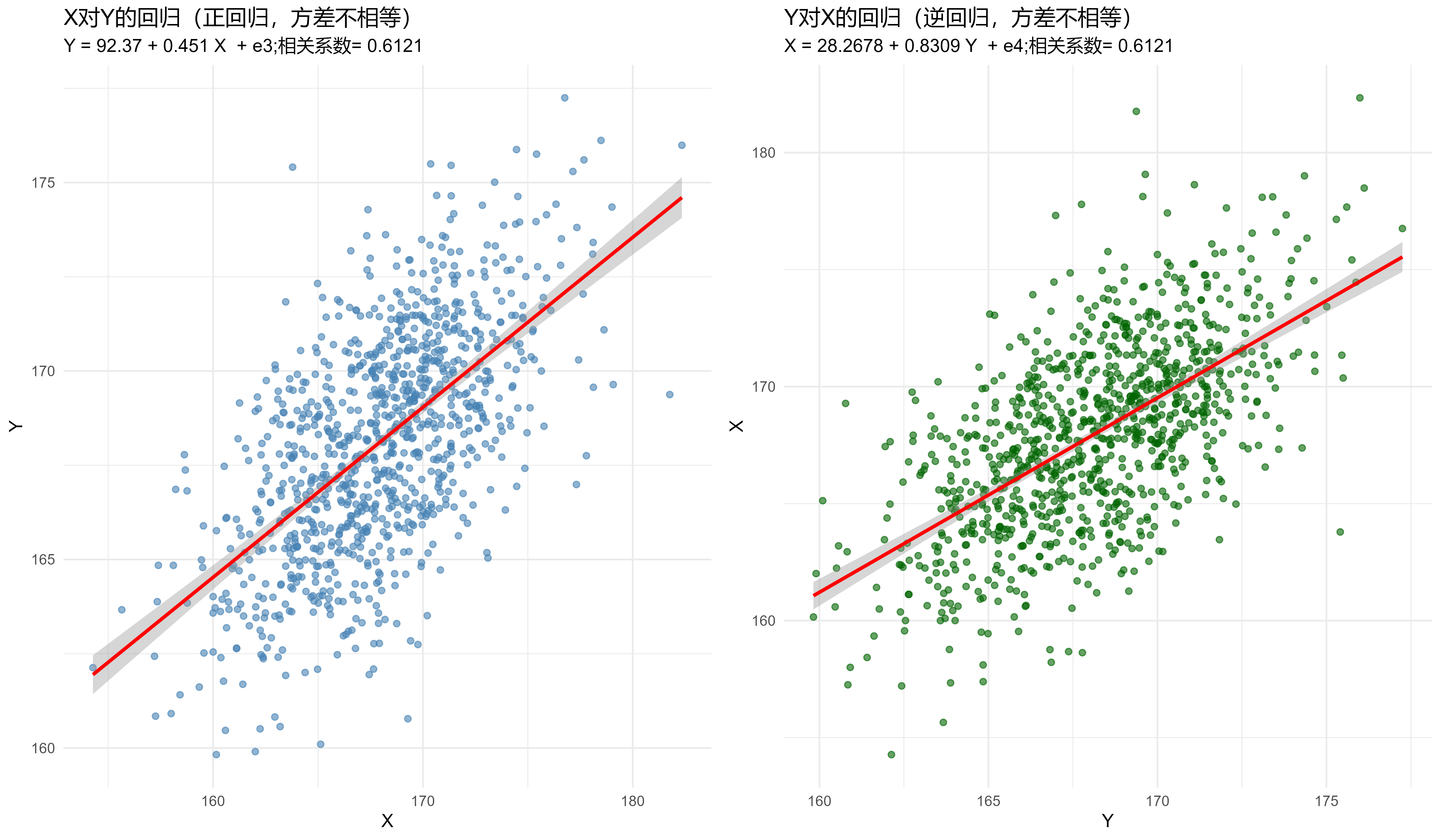 - 系数不相等性:\(Y\)对\(X\)的回归系数与\(X\)对\(Y\)的逆回归系数不相等